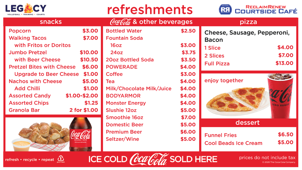 Please NO OUTSIDE FOOD OR DRINK (NO COOLERS!) will be allowed inside Legacy VTC. Legacy VTC has a full concession stand available.